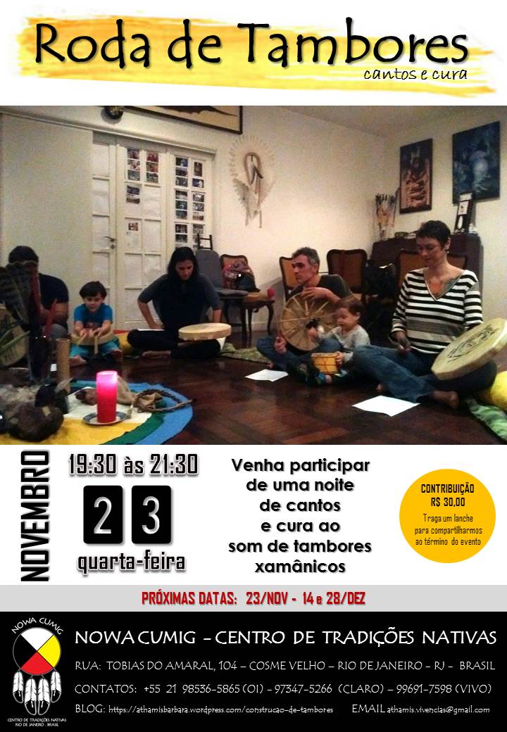 Eu gostaria de compartilhar uma coisa com vocês. Quando eu aprendi a fazer jornada xamânica há muitos anos atrás eu descobri a força que se cria em nós ao entrarmos num estado que chamamos de TETA. As pessoas podem ter visões, ou podem escutar ou ter sensações. Essas informações se tornam um oráculo e é isso que é bonito. Você mesmo tem acesso dentro de si da resposta que precisa ter para tomar decisões, ter direções na vida… Para isso precisamos de uma questão definida. Durante o encontro discutimos sobre isso e cada um vai fazer uma jornada sobre uma questão bem definida. Não costumamos interpretar as jornadas, mas lhe ajudamos a compreender algumas coisas. Quando pensamos a propor no Centro Nowa Cumig, pensamos em oferecer essa pérola a todos que se interessam pela xamanismo, que é a arte do êxtase. Como no centro não usamos plantas enteógenas, usamos o som do tambor para atingir esse estado. Aproveitem pois só acontece uma vez por mês. Migwetch (Obrigada em Ojibway). – Athamis