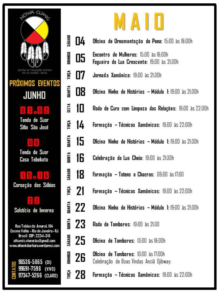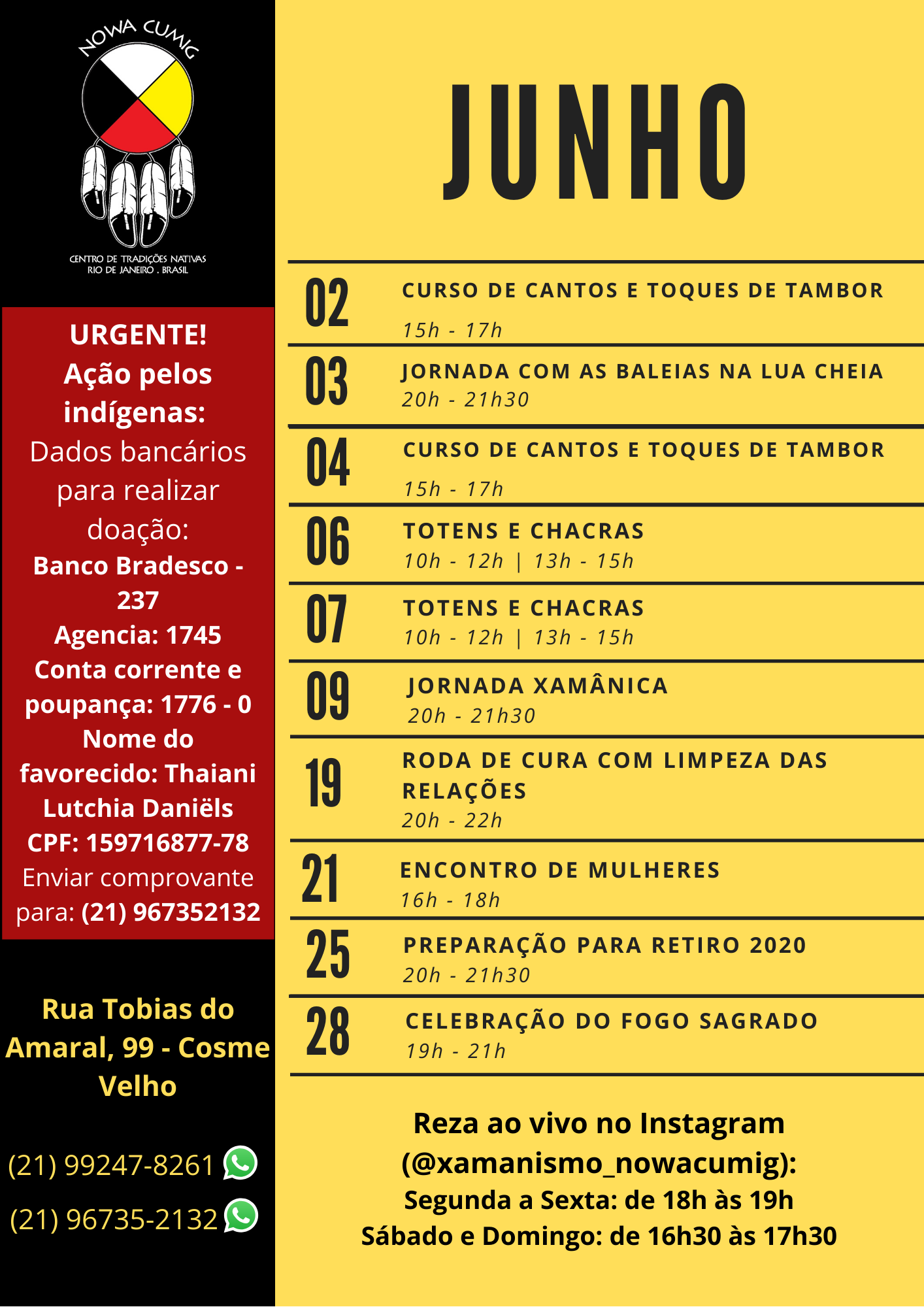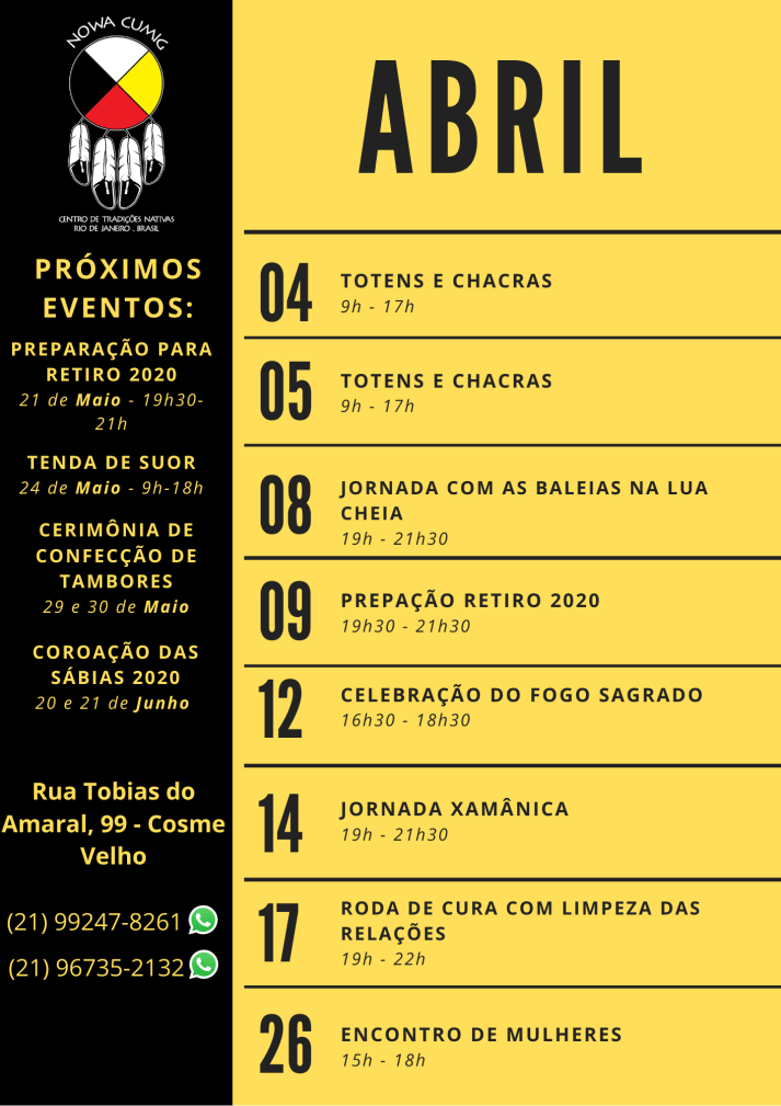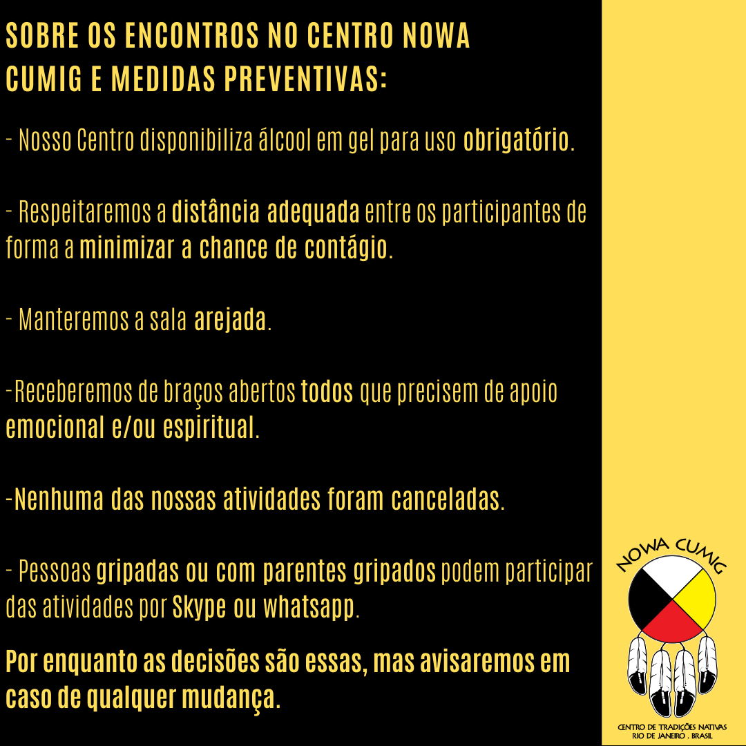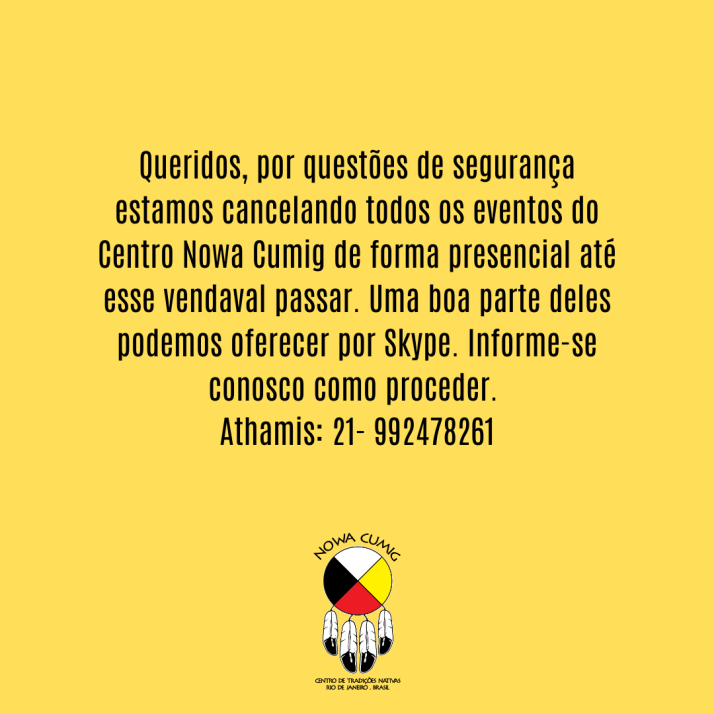 Queridos, na nossa programação do mês de março teríamos alguns eventos como: Vinda do Pajé , Xamanismo para Crianças, Celebração do Equinócio e Oficina de Confecção de Tambores. Como medida de segurança cancelamos o Equinócio e Xamanismo para Crianças. Para o pessoal que iria receber o nome espiritual pedimos que aguardem para recebê-lo em junho.