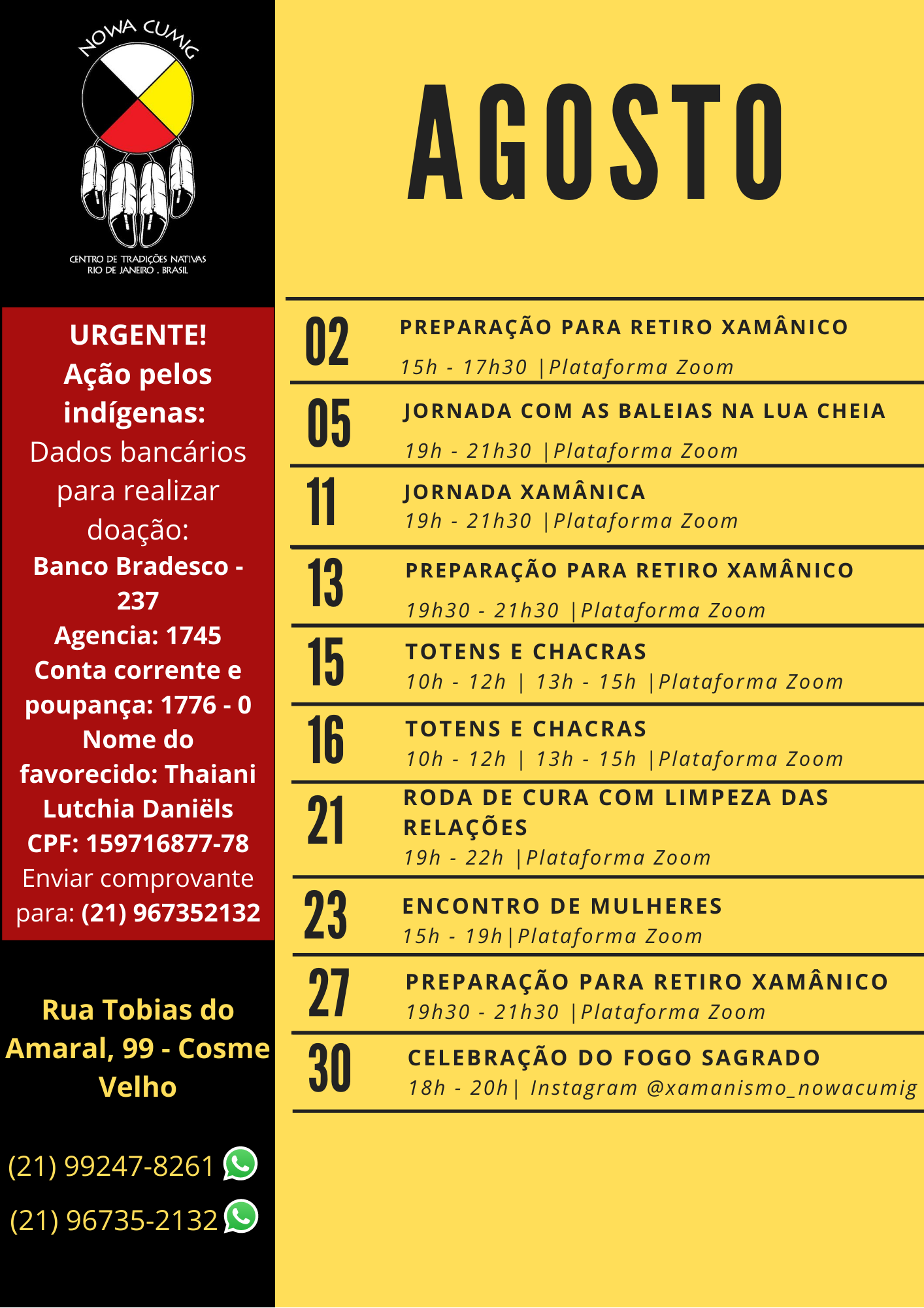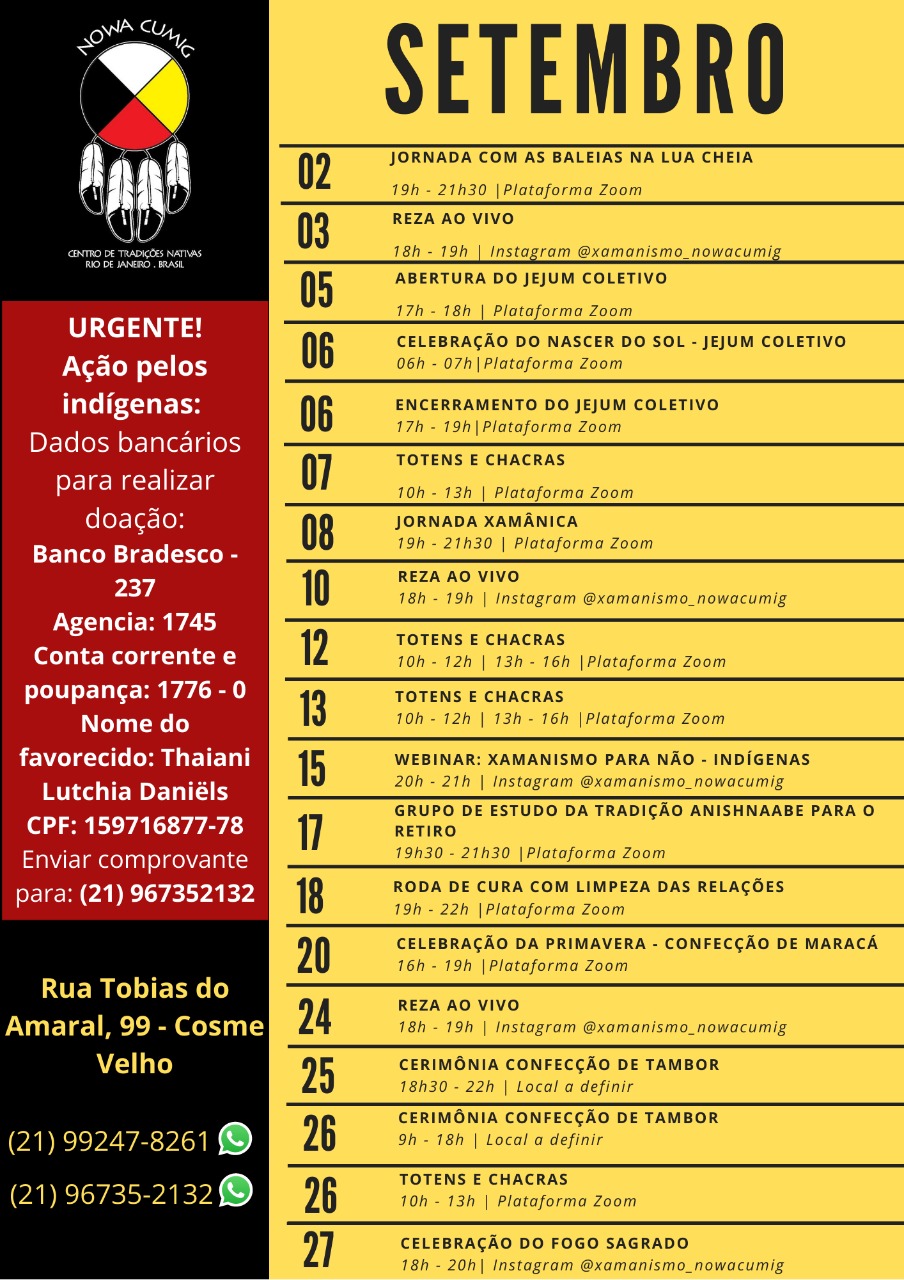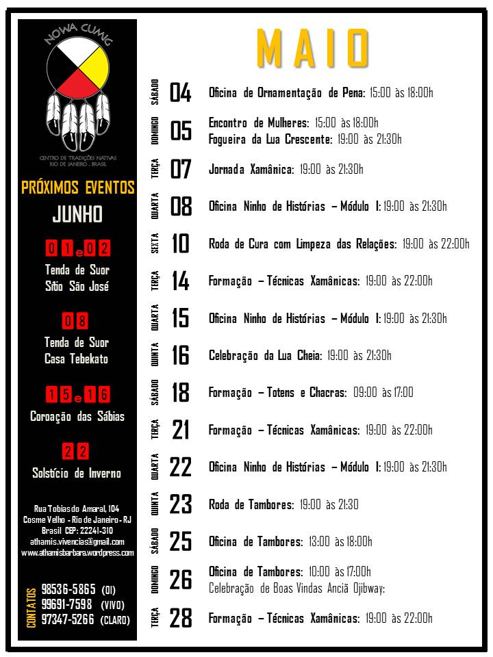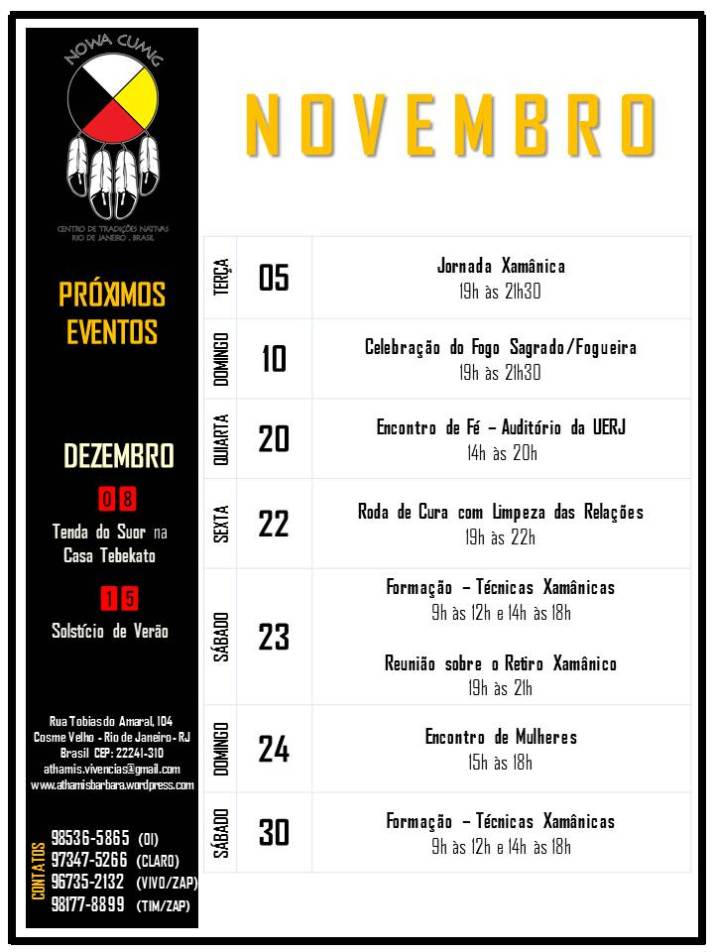 Queridos, na nossa programação do mês de março teríamos alguns eventos como: Vinda do Pajé , Xamanismo para Crianças, Celebração do Equinócio e Oficina de Confecção de Tambores. Como medida de segurança cancelamos o Equinócio e Xamanismo para Crianças. Para o pessoal que iria receber o nome espiritual pedimos que aguardem para recebê-lo em junho.
