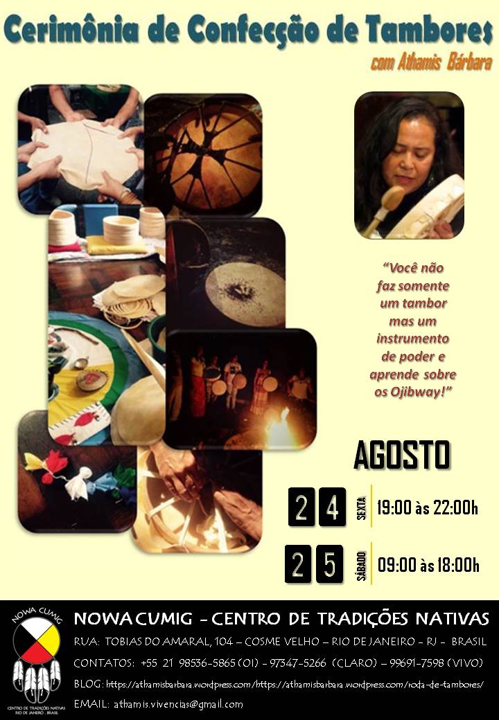 Quando resolvi fazer meu próprio tambor o universo me enviou para o Canadá, onde aprendi a fazer o meu tambor na tradição Ojibway. Depois pedi para que viessem ao Brasil ensinar esta arte a mais companheiros de jornada. Uns anos depois recebi a autorização para eu mesma liderar as oficinas. Já se vão 20 anos fazendo tambores no Brasil e no mundo.