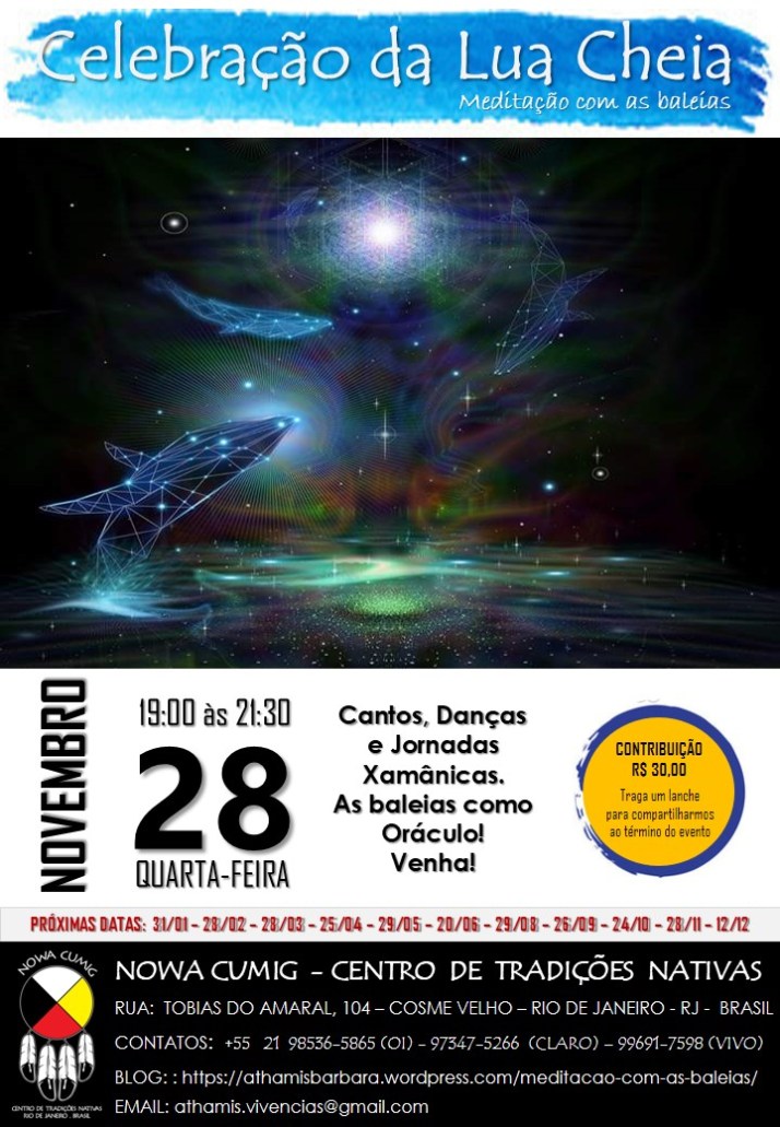Celebramos a Lua Cheia, a avó, Nokomis. Ficamos felizes com o ápice dessa avó, que tanto mexe com as águas do nosso planeta, como com nossas águas internas. Celebrá-la é também honrar nossa Terra e a nós mesmos. Nas meditações que fizemos com as baleias anos atrás, nos foi pedido que também meditássemos com esses incríveis cetáceos durante a lua cheia. Desde que inauguramos o Centro Nowa Cumig então, celebrar a Lua Cheia inclui a Meditação com as Baleias através de uma jornada xamânica. Além da jornada, dançamos, tocamos tambores, cantamos e compartilhamos saberes ancestrais.
