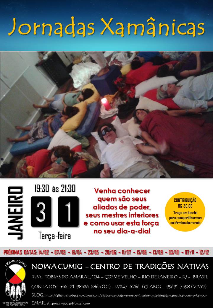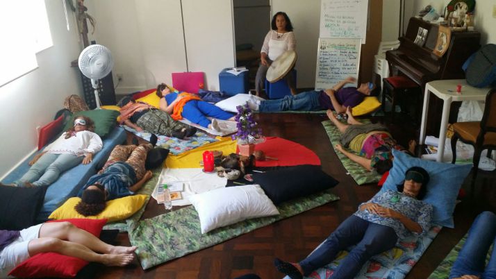 Eu gostaria de compartilhar uma coisa com vocês. Quando eu aprendi a fazer jornada xamânica há muitos anos atrás eu descobri a força que se cria em nós ao entrarmos num estado que chamamos de TETA. As pessoas podem ter visões, ou podem escutar ou ter sensações. Essas informações se tornam um oráculo e é isso que é bonito. Você mesmo tem acesso dentro de si da resposta que precisa ter para tomar decisões, ter direções na vida… Para isso precisamos de uma questão definida. Durante o encontro discutimos sobre isso e cada um vai fazer uma jornada sobre uma questão bem definida. Não costumamos interpretar as jornadas, mas lhe ajudamos a compreender algumas coisas. Quando pensamos a propor no Centro Nowa Cumig, pensamos em oferecer essa pérola a todos que se interessam pela xamanismo, que é a arte do êxtase. Como no centro não usamos plantas enteógenas, usamos o som do tambor para atingir esse estado. Aproveitem pois só acontece uma vez por mês. Migwetch (Obrigada em Ojibway). – Athamis