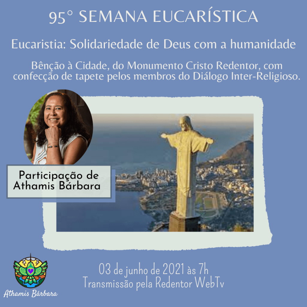 Próxima quarta-feira, 03 de junho às 7h Athamis Bárbara participará de Benção à Cidade do Rio de Janeiro. Junto com irmãos do diálogo inter-religioso, com ministração de Dom Orani Tempesta. Será transmitido pela Redentor WebTv e Rádio Catedral.